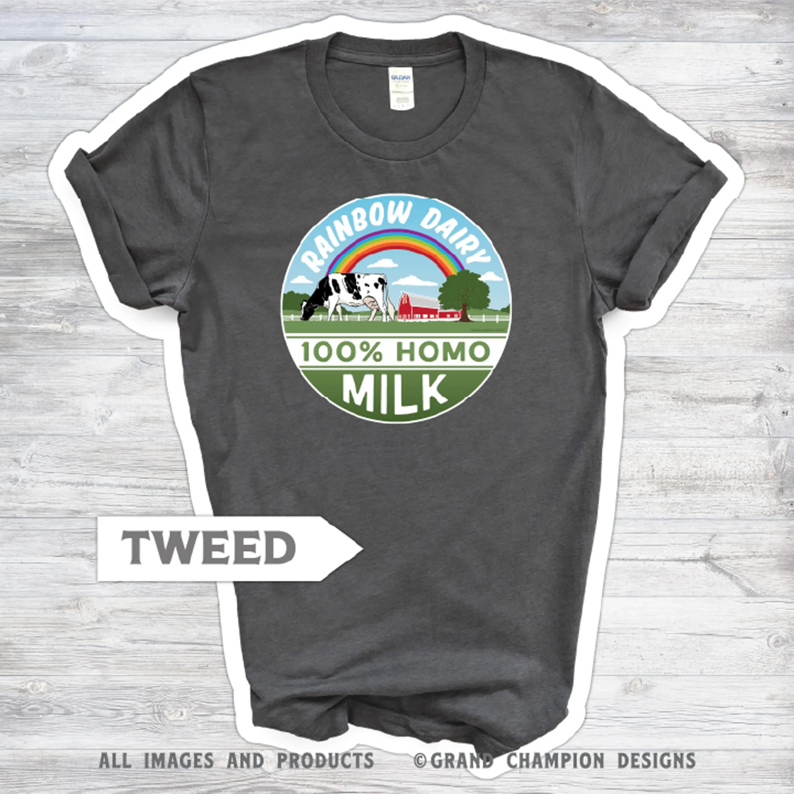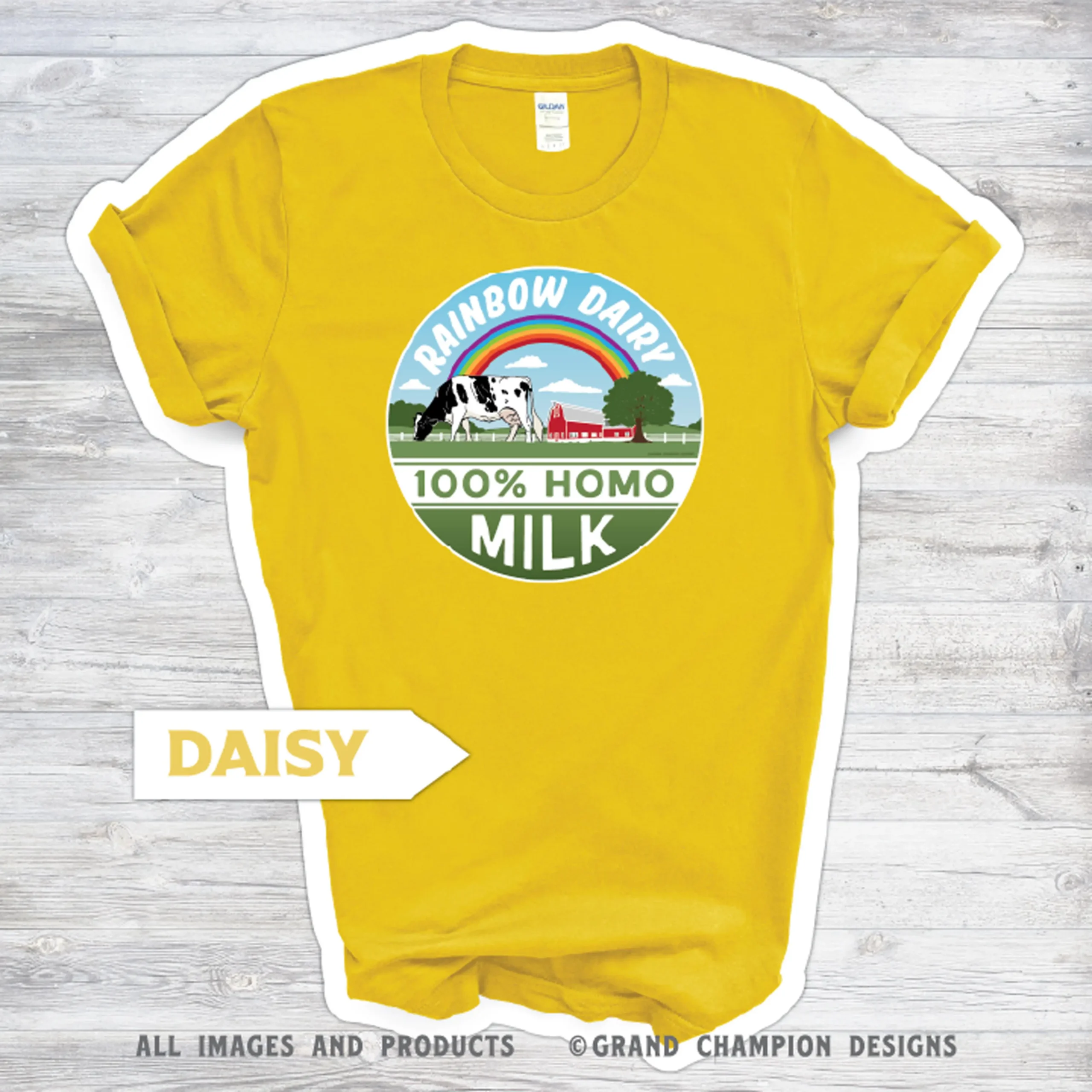 Who wants 2% homo when you can be 100% homo? C’mon. Inspired by vintage milk bottle caps and their… ‘vintage’ use of abbreviations, this design is a not-so-subtle nod to queer farmers yesterday, today and tomorrow. Hey, somewhere over that rainbow, amirite?