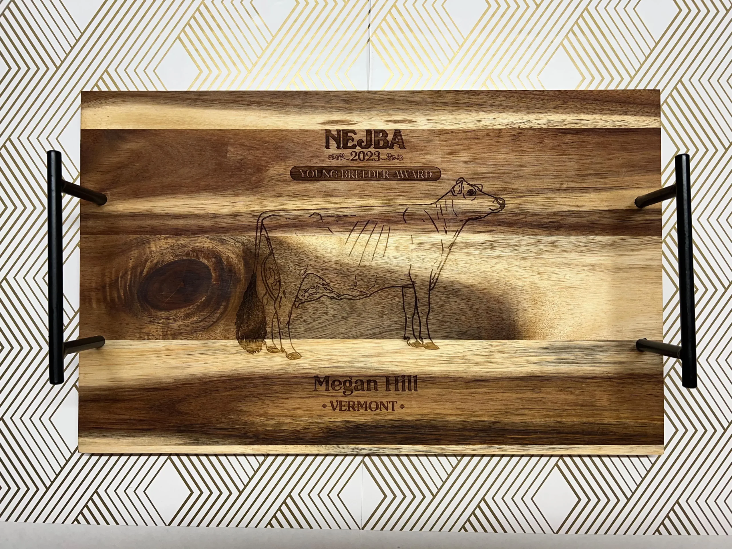 These beautiful, rich acacia wood trays are great options for shows or gifts. We can engrave anything from our library of artwork, or send us your logo!