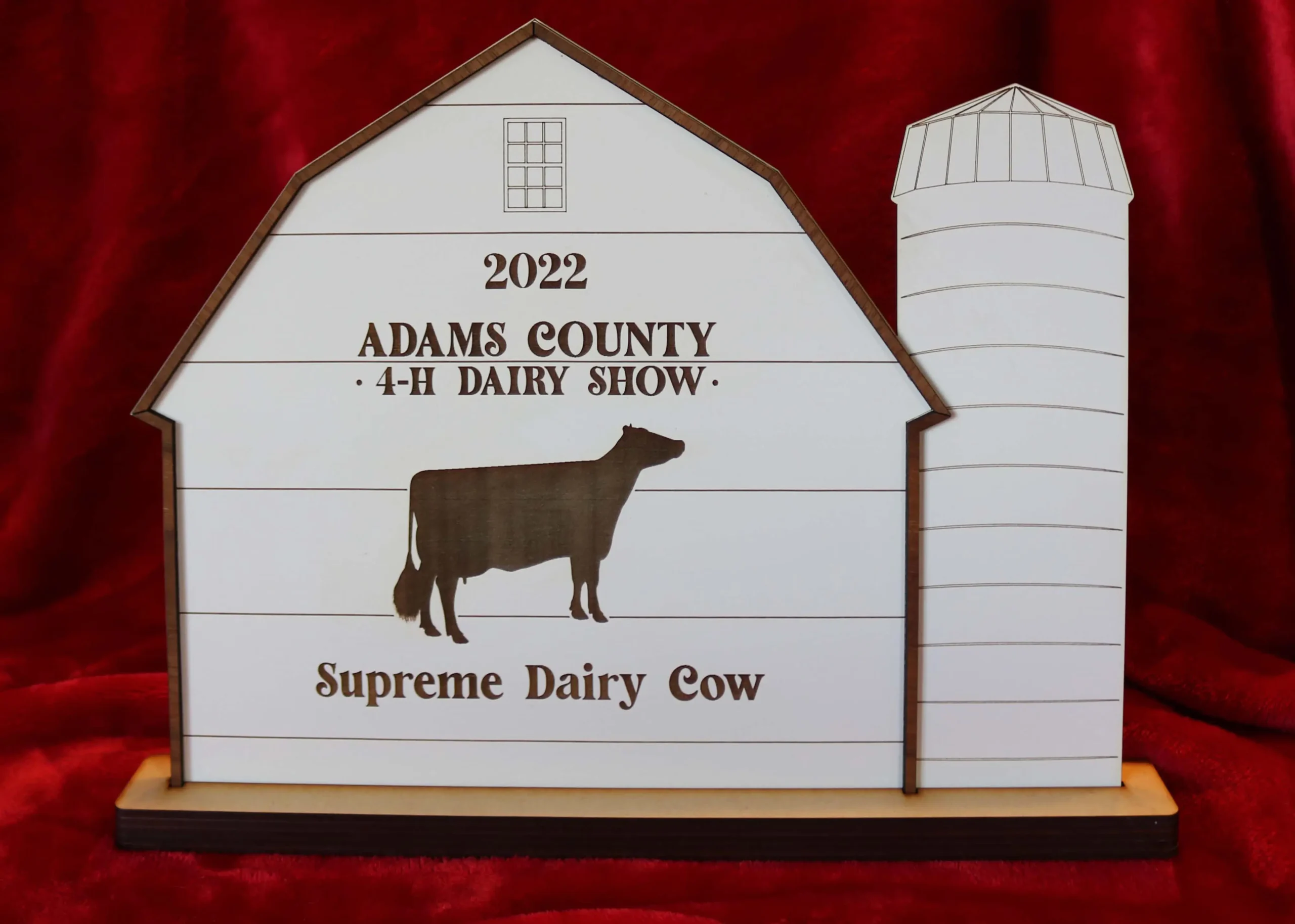 Cut from ⅛” MDF and ⅛” walnut for barn border. Standard Barn and Silo awards measure 10″ at the base and just under 8″ tall. Other sizes available on request.