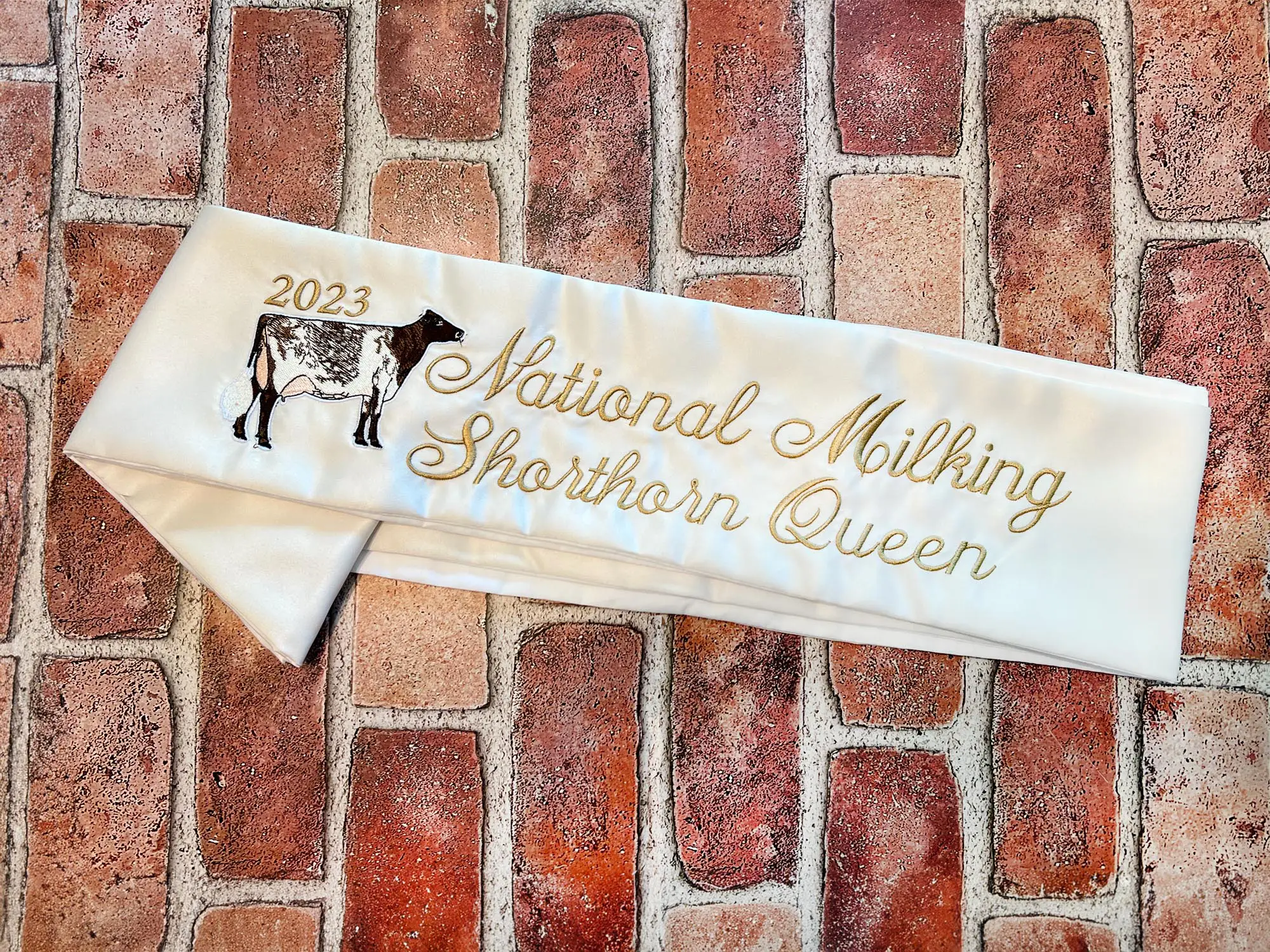 Looking for a more durable, high-quality sash for your county, state or national dairy princess? These gorgeous satin sashes are made of sturdy, show-ring-ready material that stays in place on the wearer’s shoulder, has an easy-to-use velcro fastening, and is sure to stand out with our beautiful dairy cow embroidery!