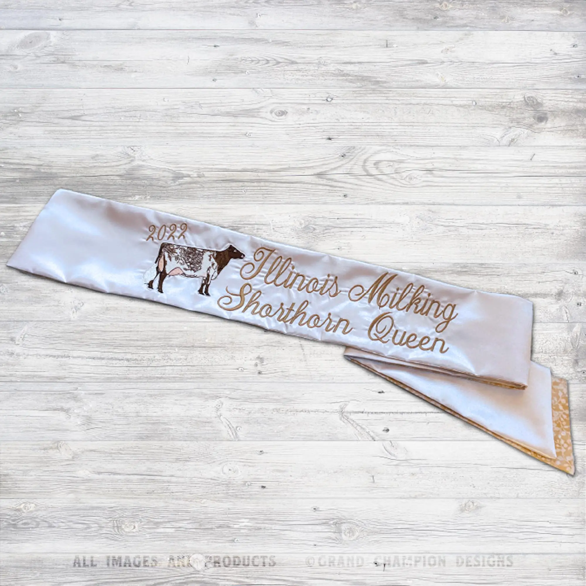 Each sash is customizable with your text and your choice of breed head or full body embroidery. We’ll choose a lining color to complement the cow color, unless you tell us differently. We know these sashes are sure to impress at your next meeting or show!
