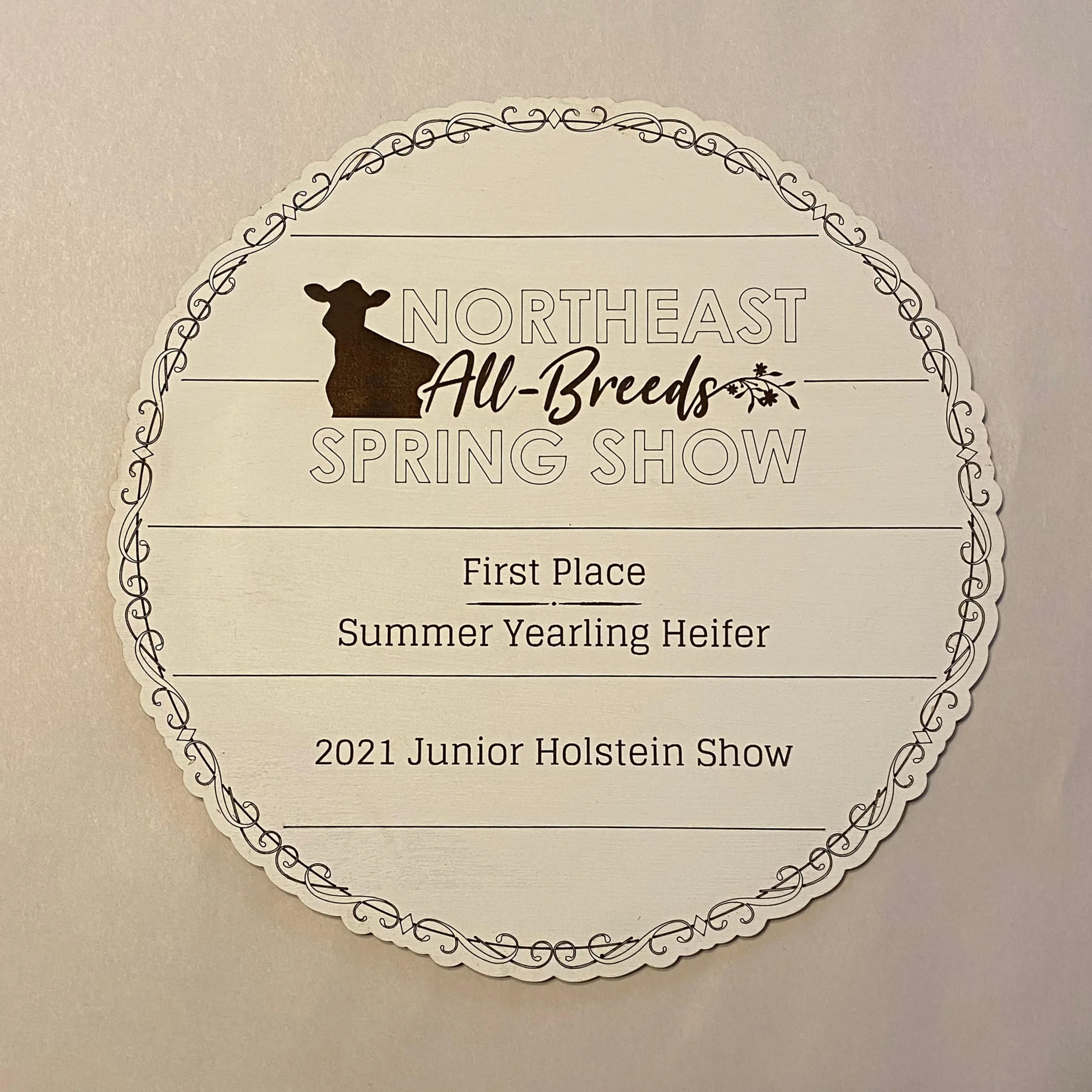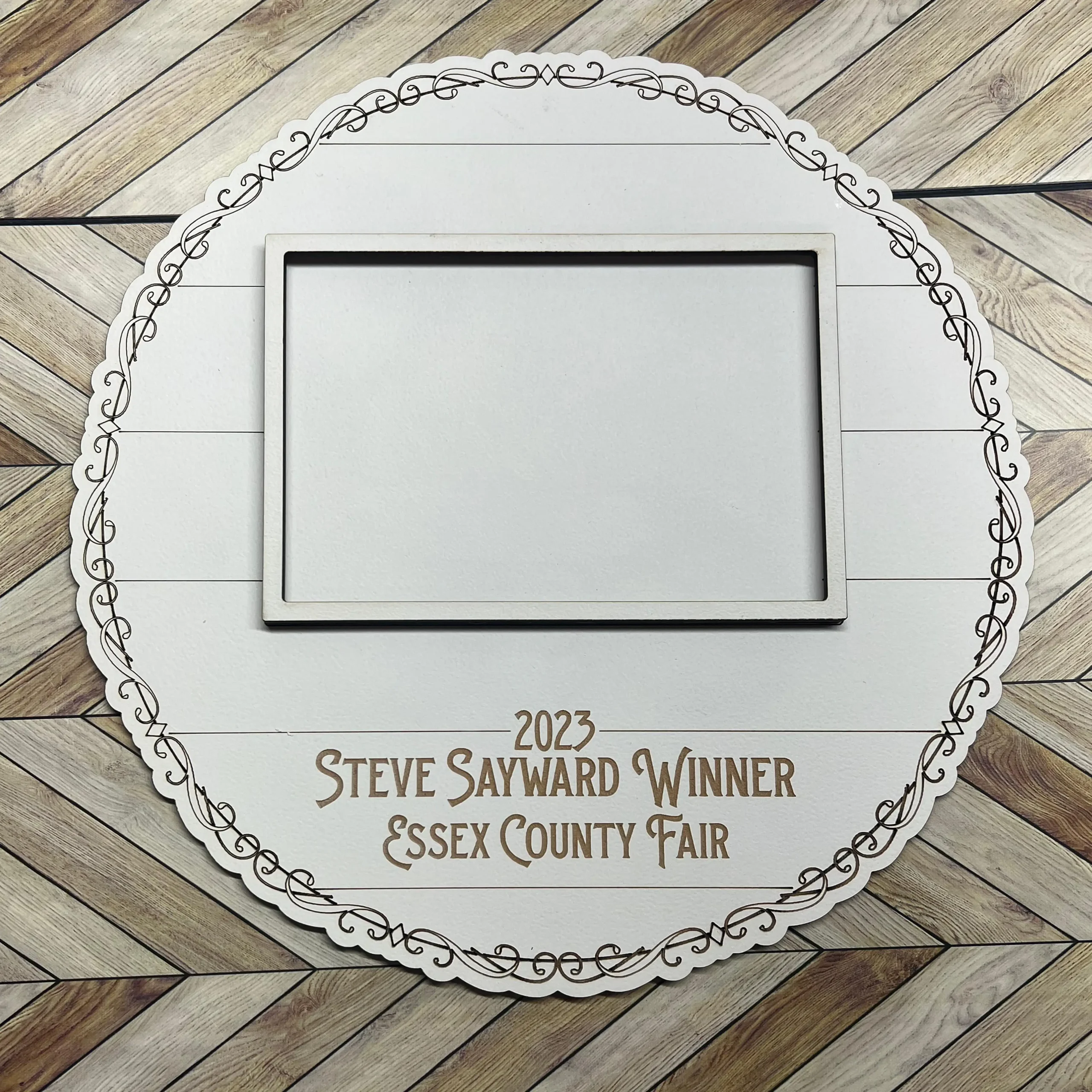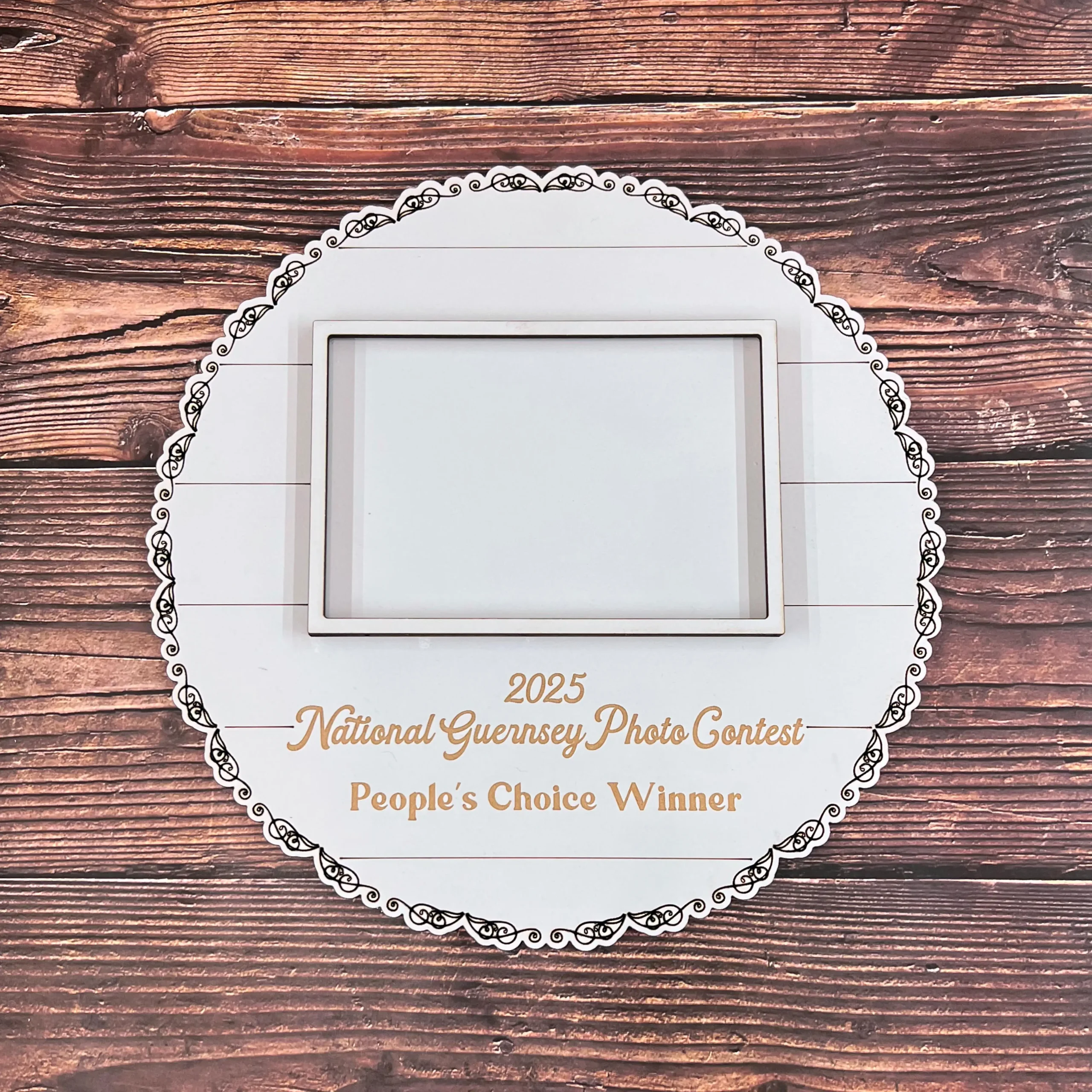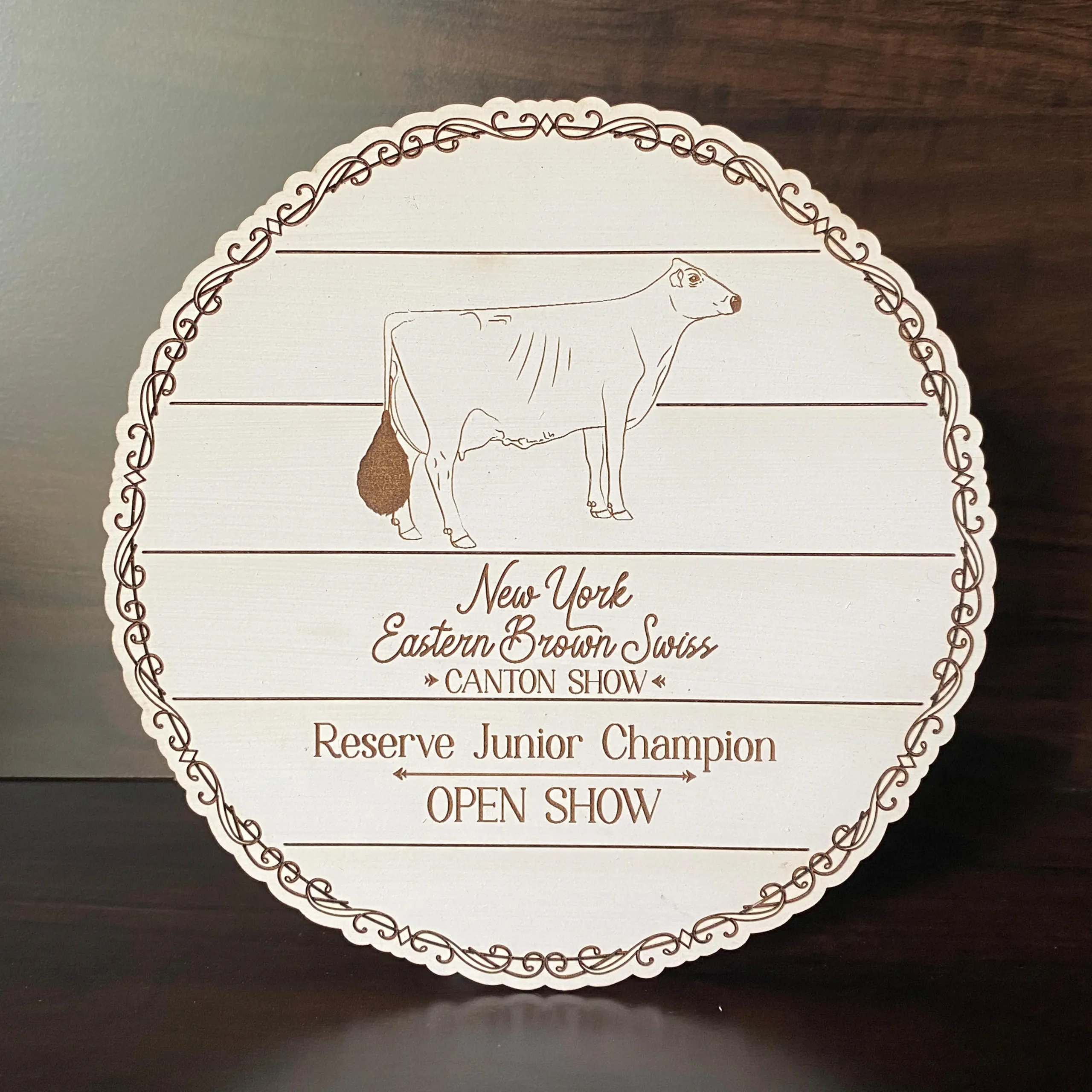 Etched with faux shiplap lines, these budget-friendly rounds come in whitewashed or plain for the rustic feel of your choice, and we can add a patterned or filigree edge for a touch of class. We can add a frame on the front for a slide-in photo, or engrave your logo, our cow artwork, or something else onto the plaque! Choose from our standard dairy or livestock breed artwork, your show logo or other custom artwork.