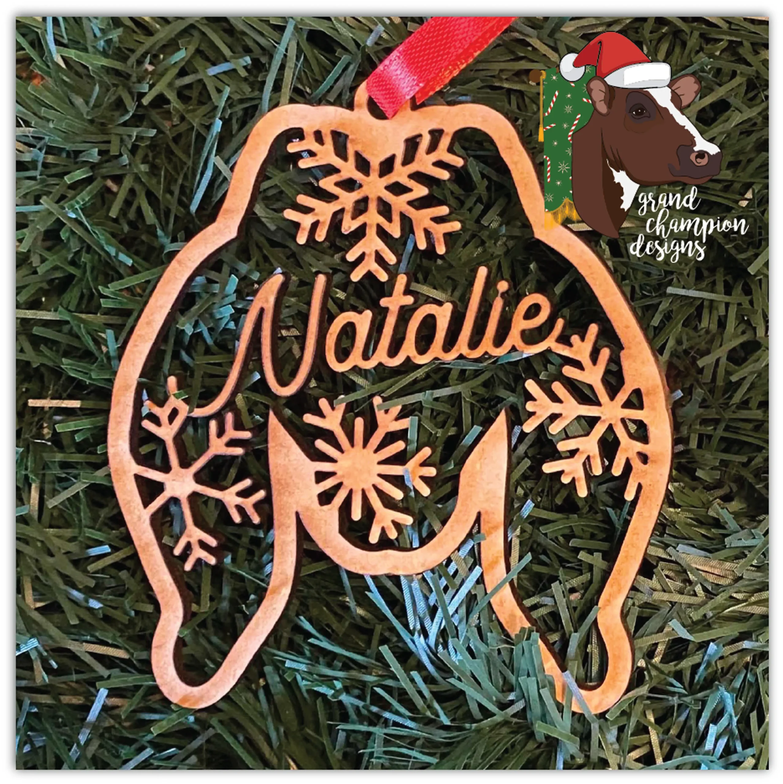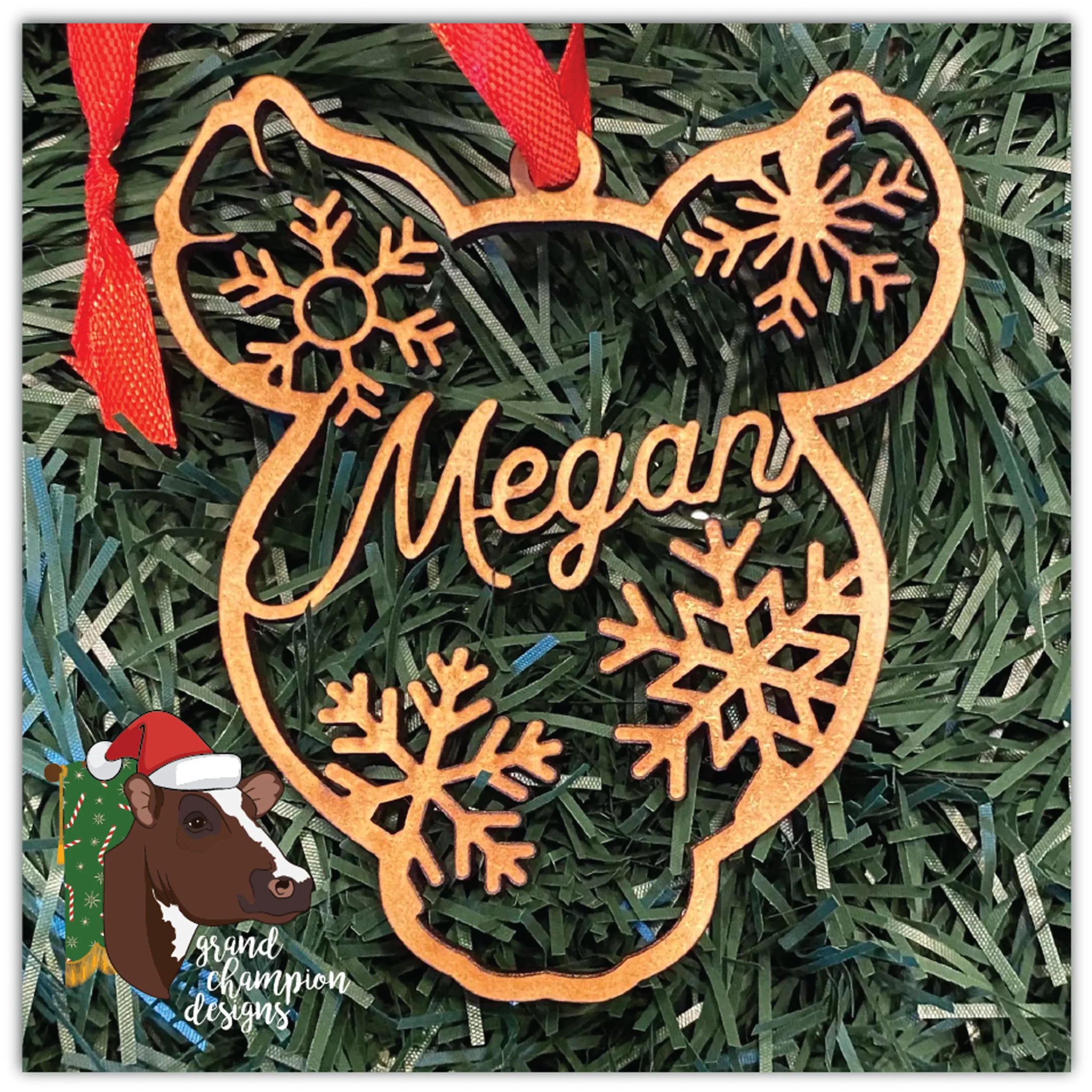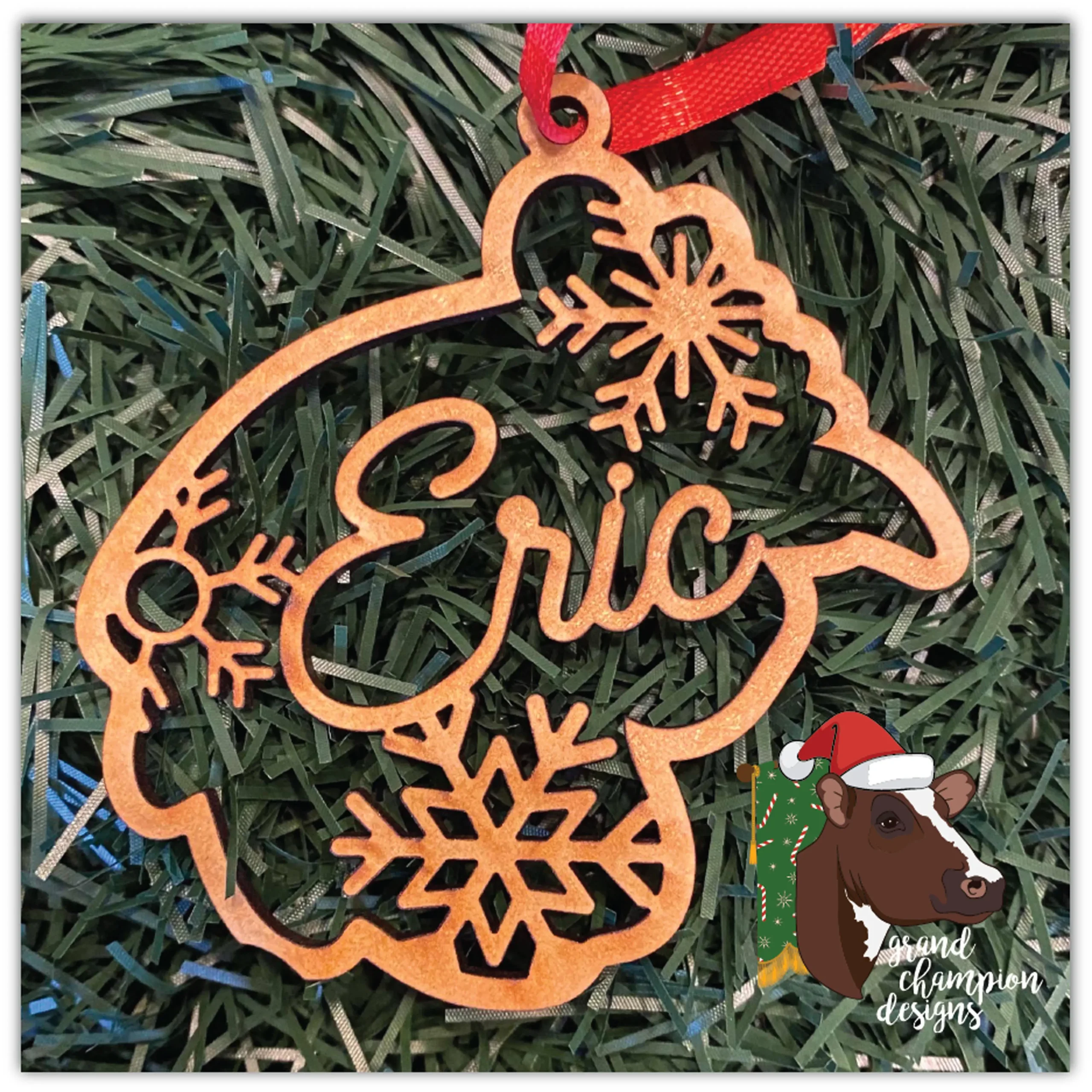 Personalization included. Ornaments measure 3.5″ tall and are cut of ⅛” MDF. Ribbon hanger included.