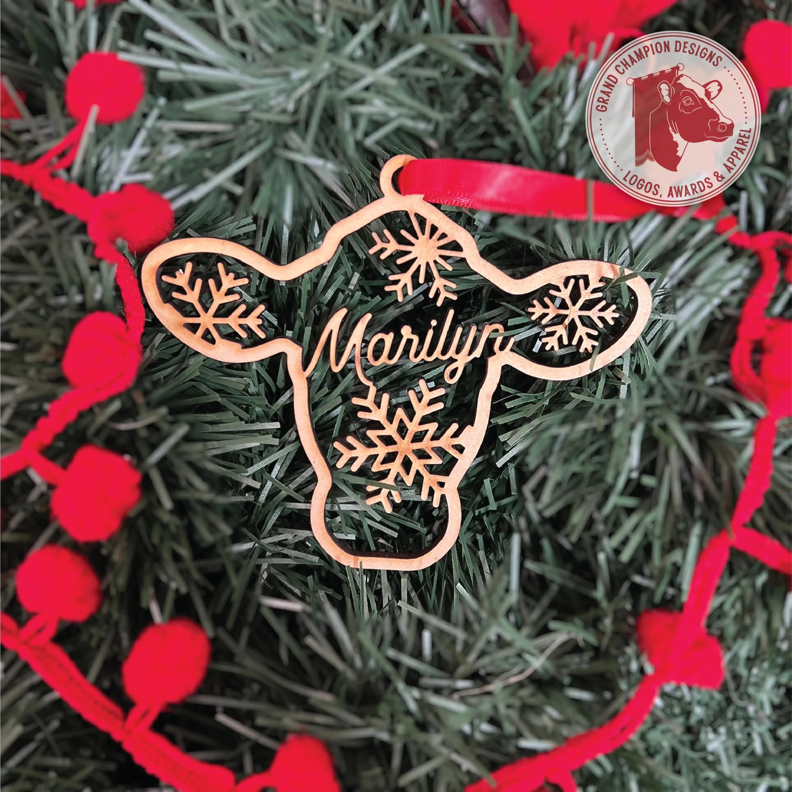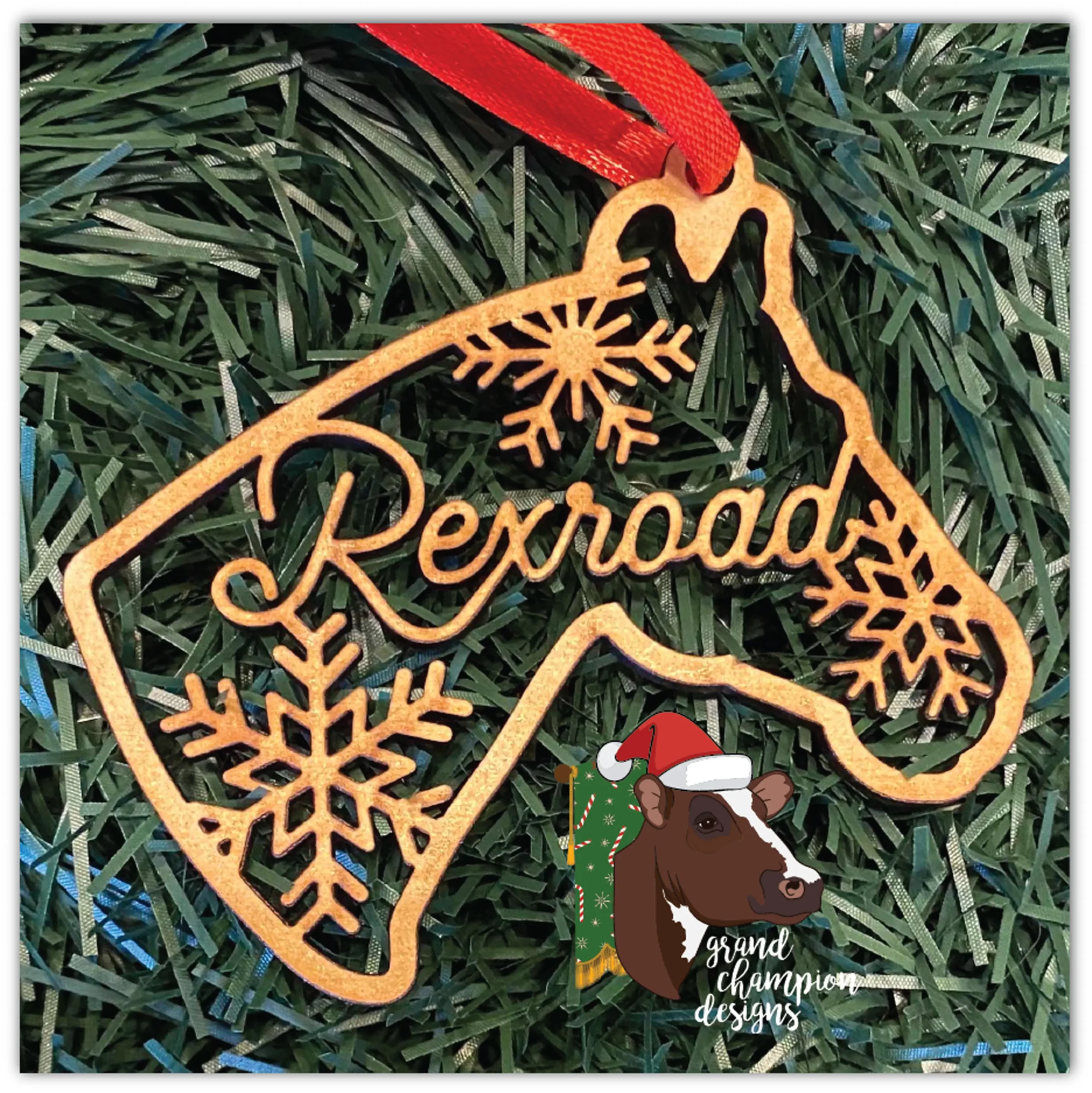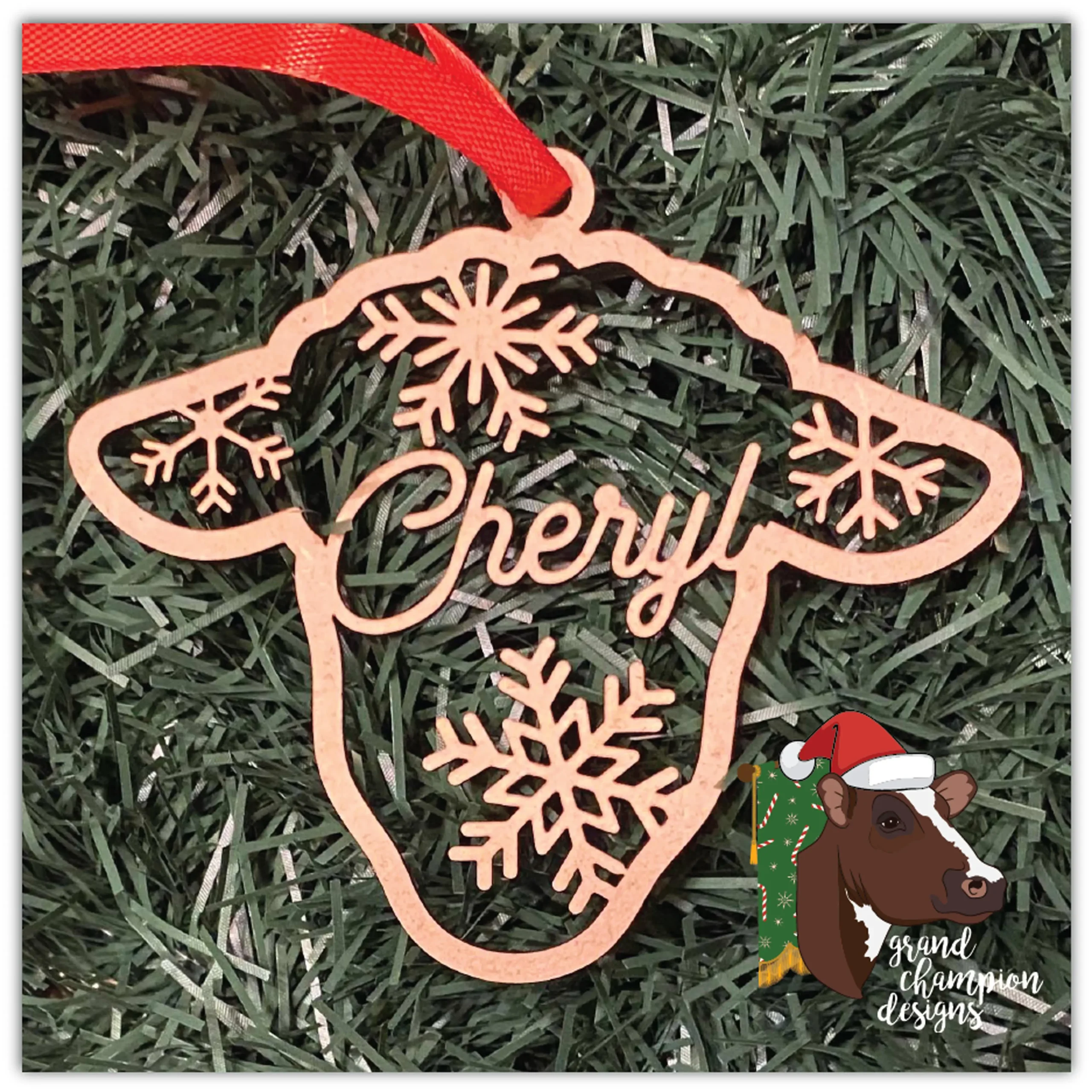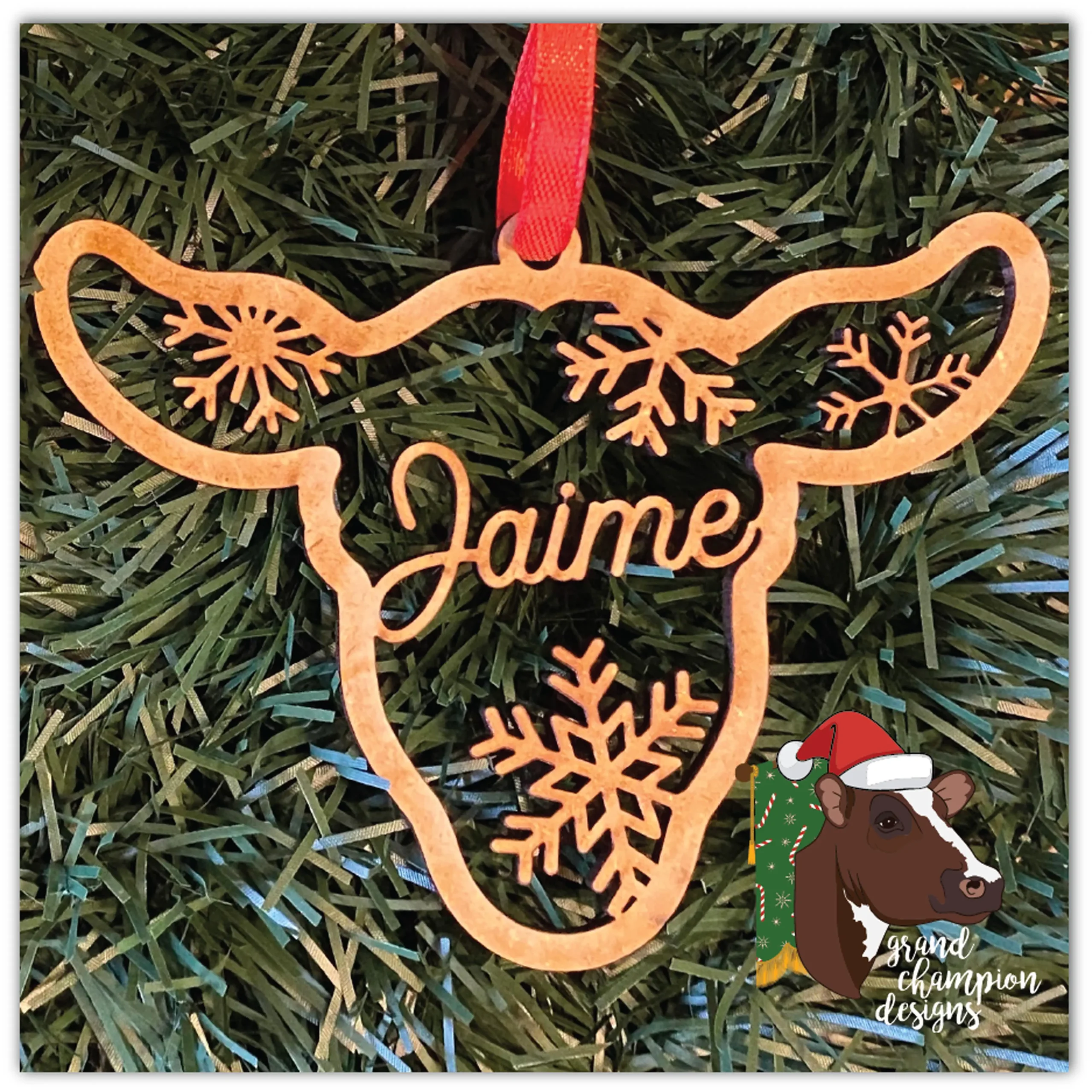 Personalization included. Ornaments measure 3.5″ tall and are cut of ⅛” MDF. Ribbon hanger included.