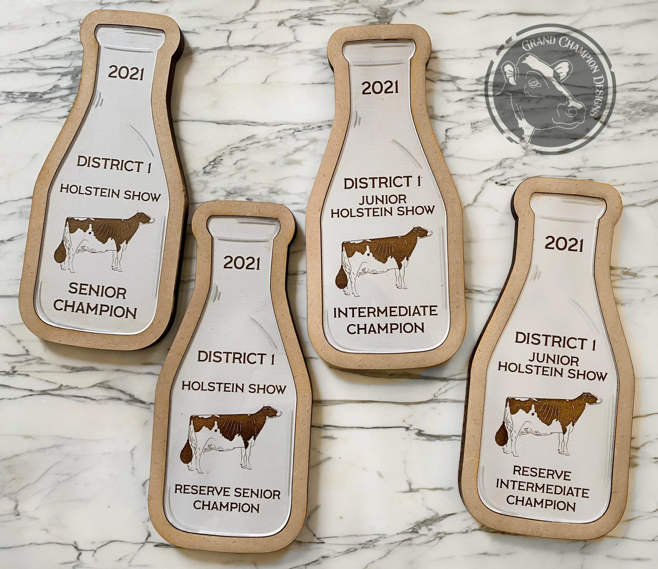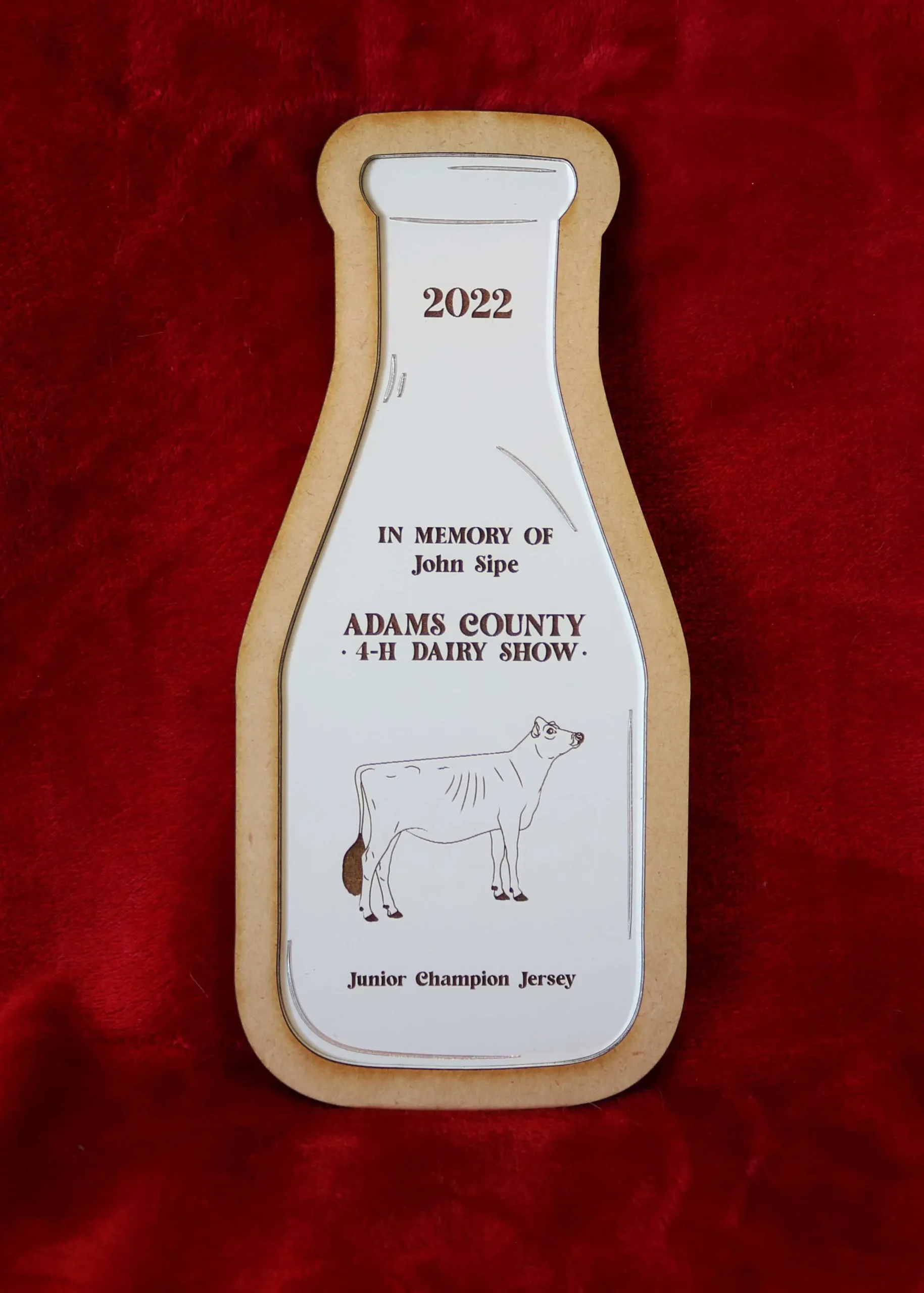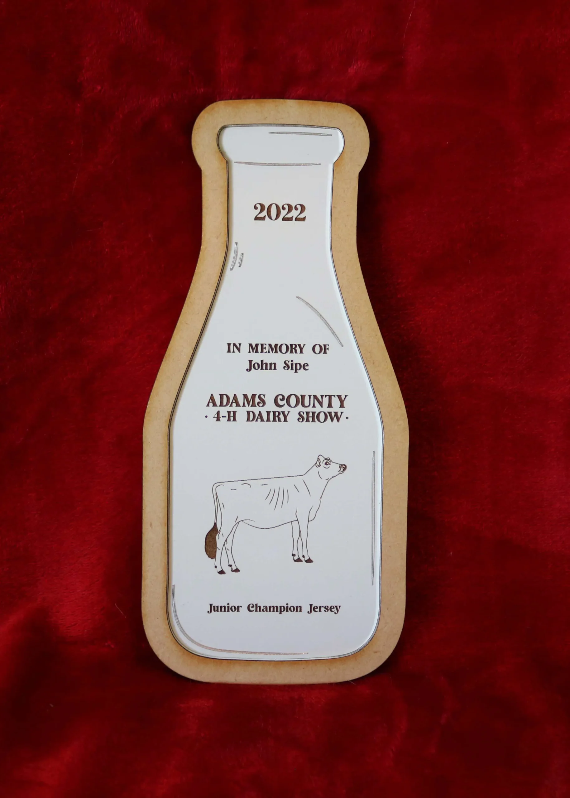 Our milk bottle plaques are an annual bestseller. Lightweight and budget-friendly, these plaques are two layers of 1/8″ MDF with a clear acrylic inlay. They’re great for show awards, recognition plaques, or employee gifts. Price includes your customized type and image – choose from our standard dairy breed artwork, or add your company’s logo.