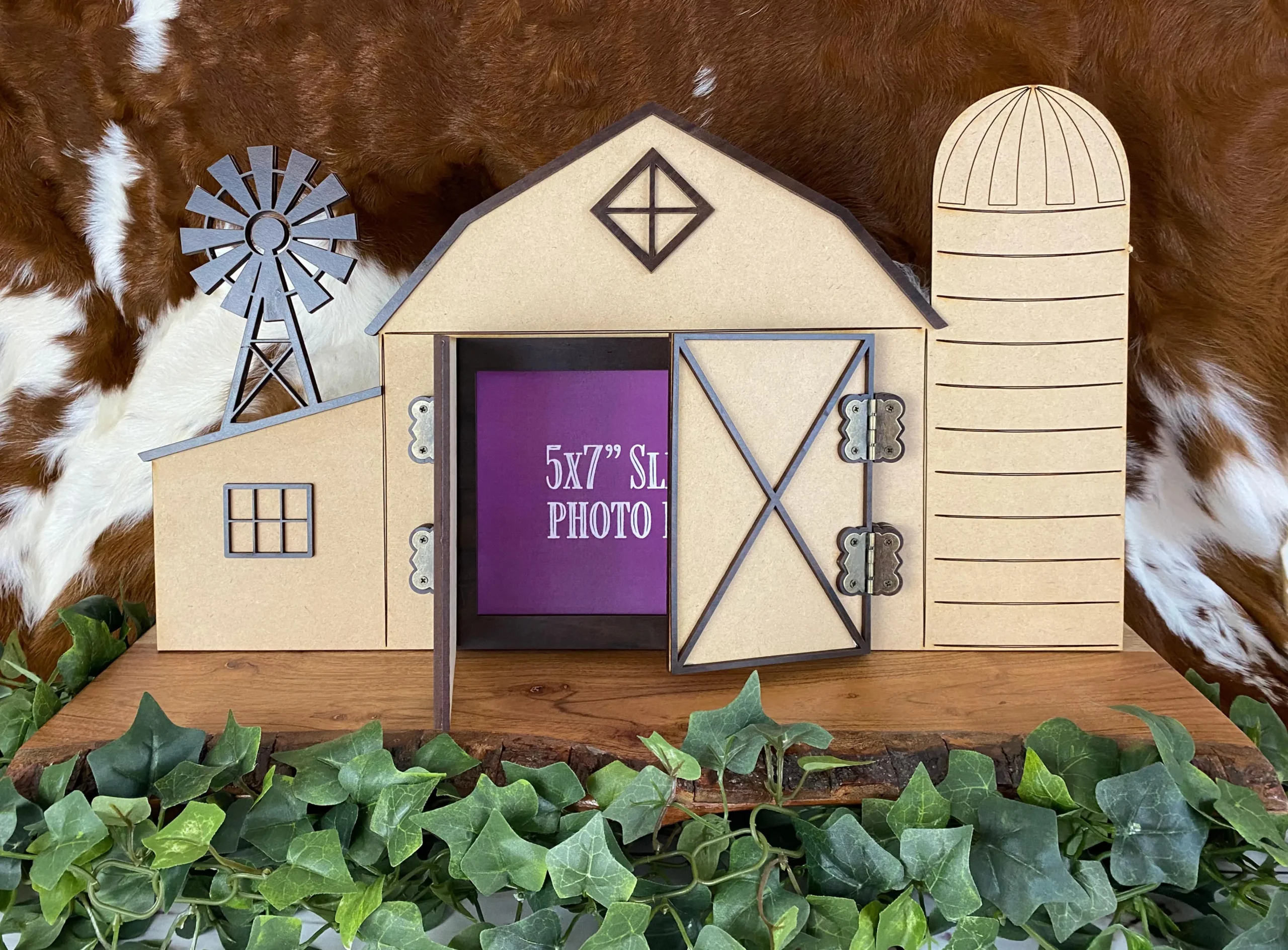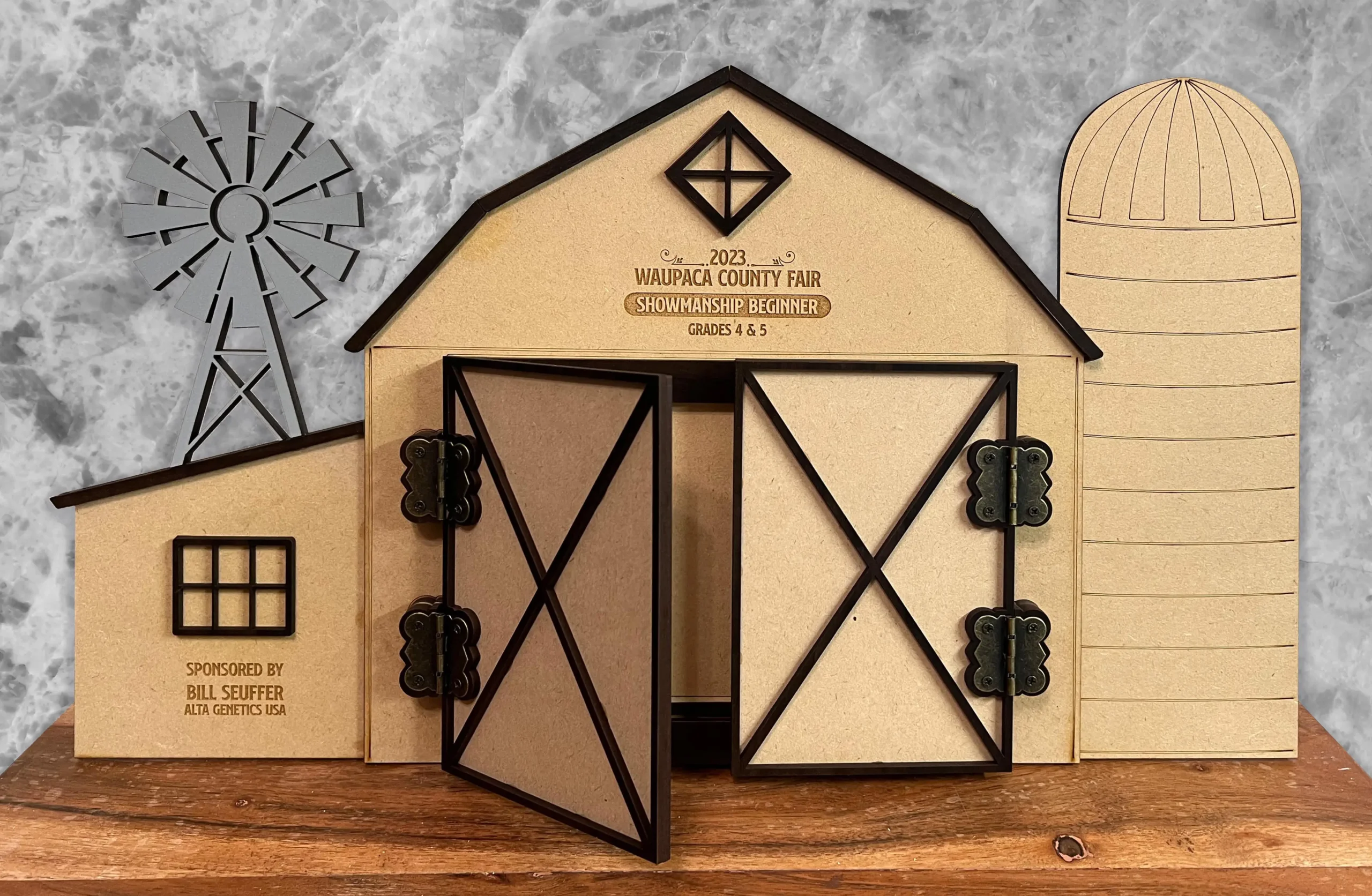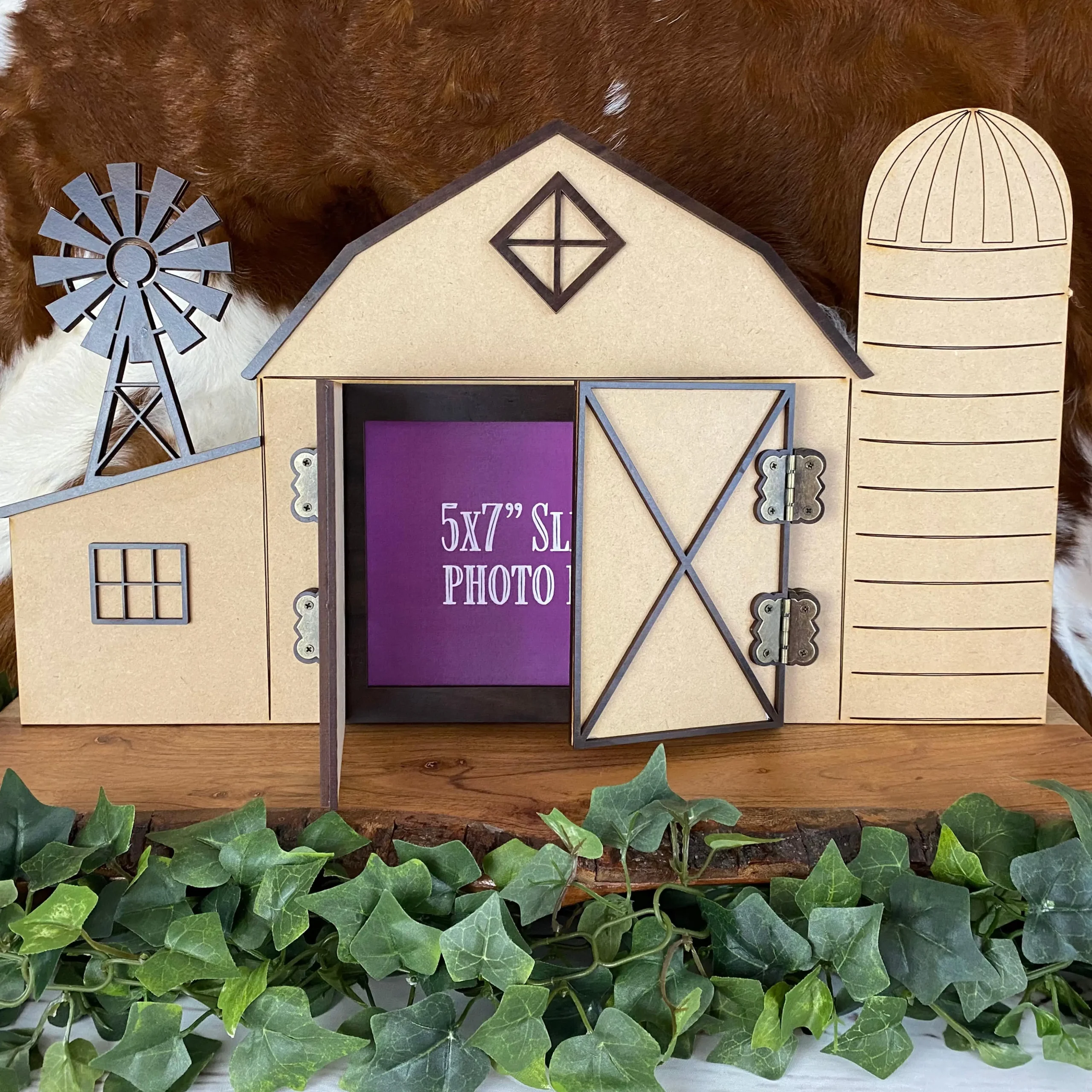 If you want a unique gift for a friend, kid, advisor or class winner, the whimsical photo barn is the perfect fit. Available in a whitewashed finish or natural MDF (pictured), the antiqued brass hinges on the barn doors of this piece allow the doors to swing open and reveal the 4×6″ photo stored inside. The kickstand in the back is removable so this piece can be stored flat for shipping or gift-giving and then stand alone on a shelf for display. The detail in this laser-cut piece shows a windmill, X-barn doors and windows on the barn, and we can add your own text for a custom touch. This photo barn display is sure to delight any recipient!