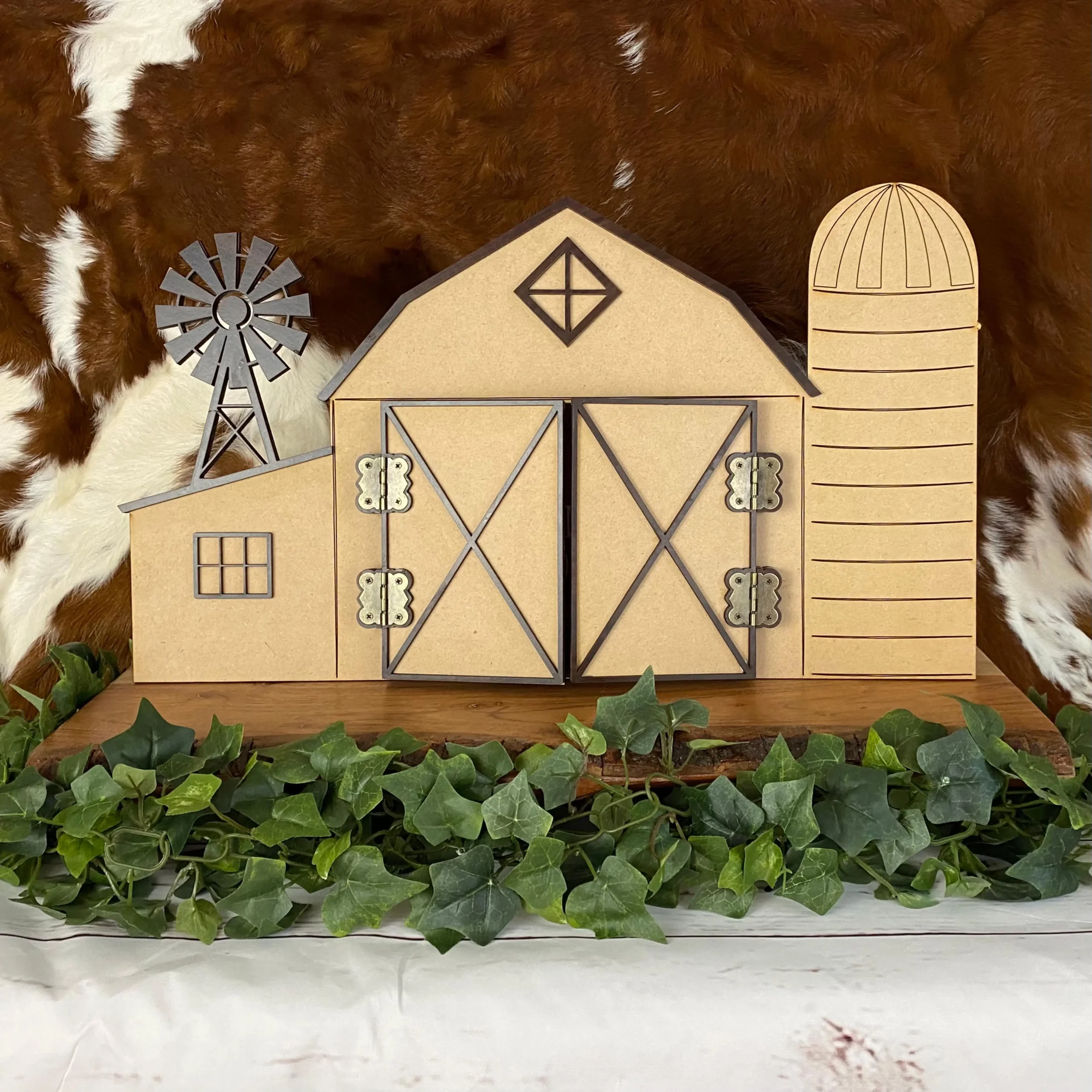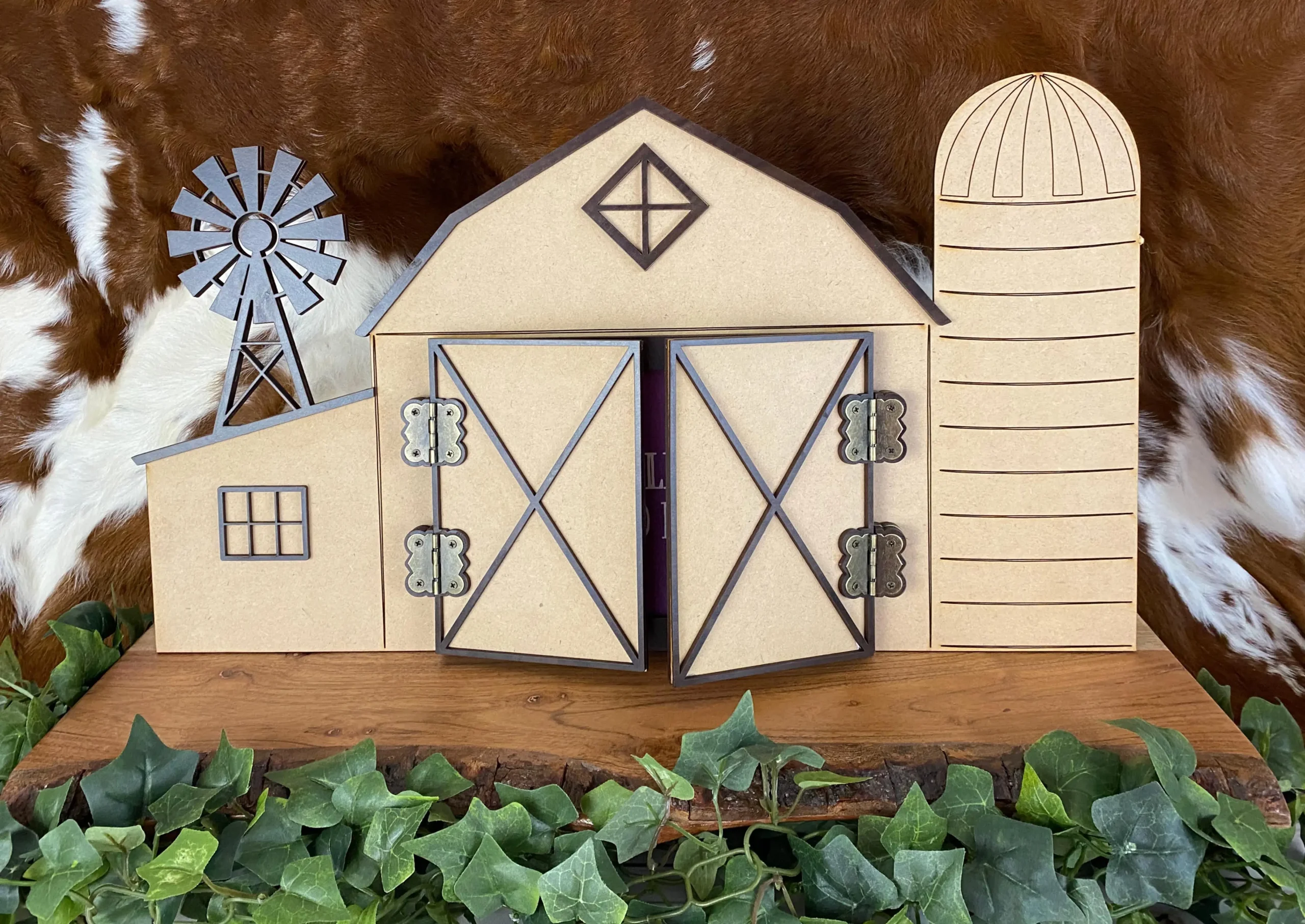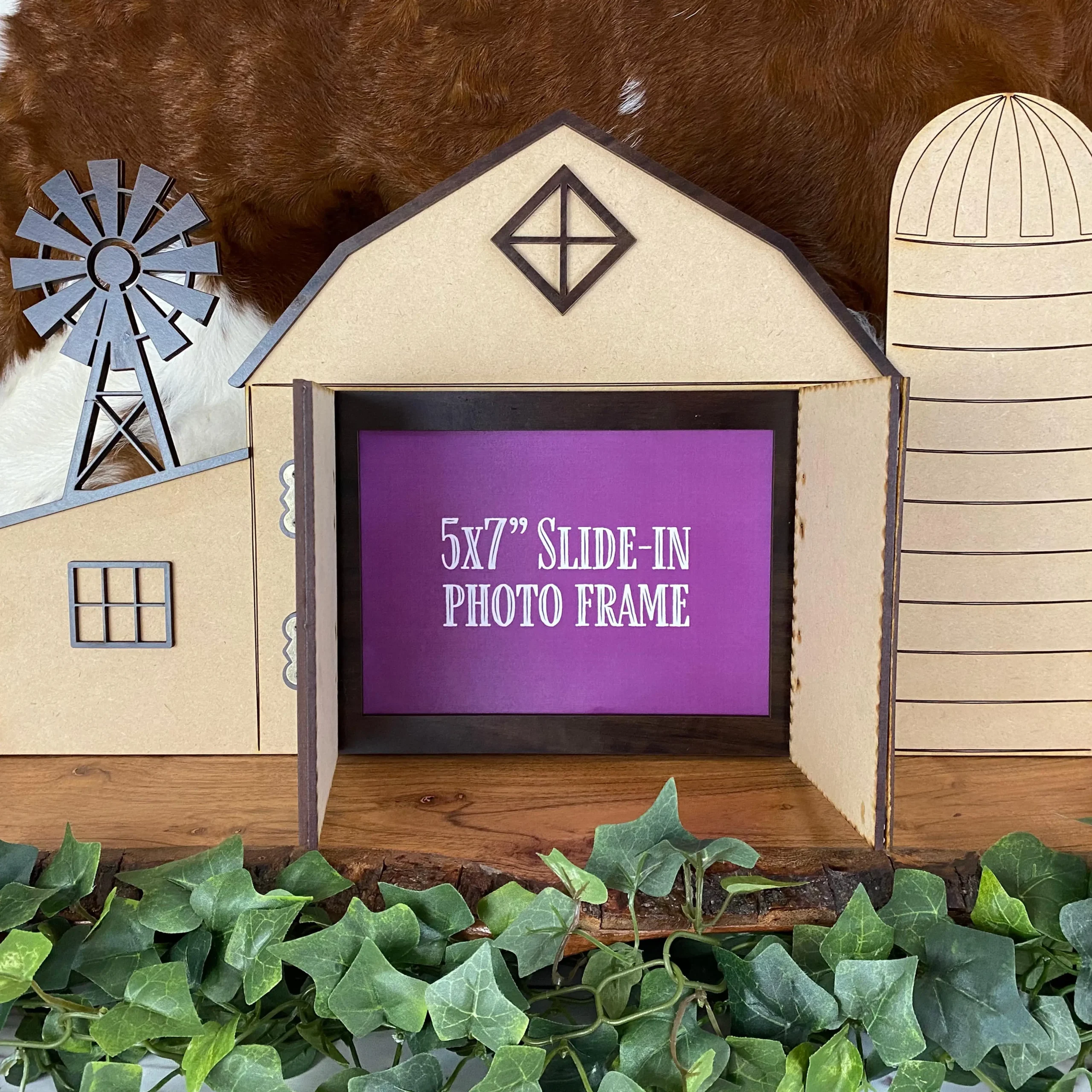 If you want a unique gift for a friend, kid, advisor or class winner, the whimsical photo barn is the perfect fit. Available in a whitewashed finish or natural MDF (pictured), the antiqued brass hinges on the barn doors of this piece allow the doors to swing open and reveal the 4×6″ photo stored inside. The kickstand in the back is removable so this piece can be stored flat for shipping or gift-giving and then stand alone on a shelf for display. The detail in this laser-cut piece shows a windmill, X-barn doors and windows on the barn, and we can add your own text for a custom touch. This photo barn display is sure to delight any recipient!
