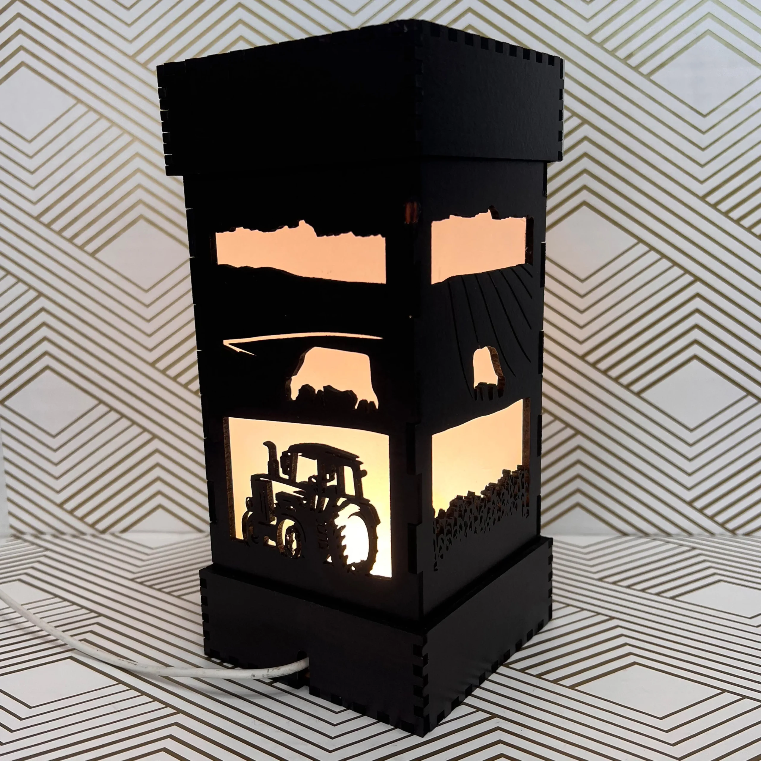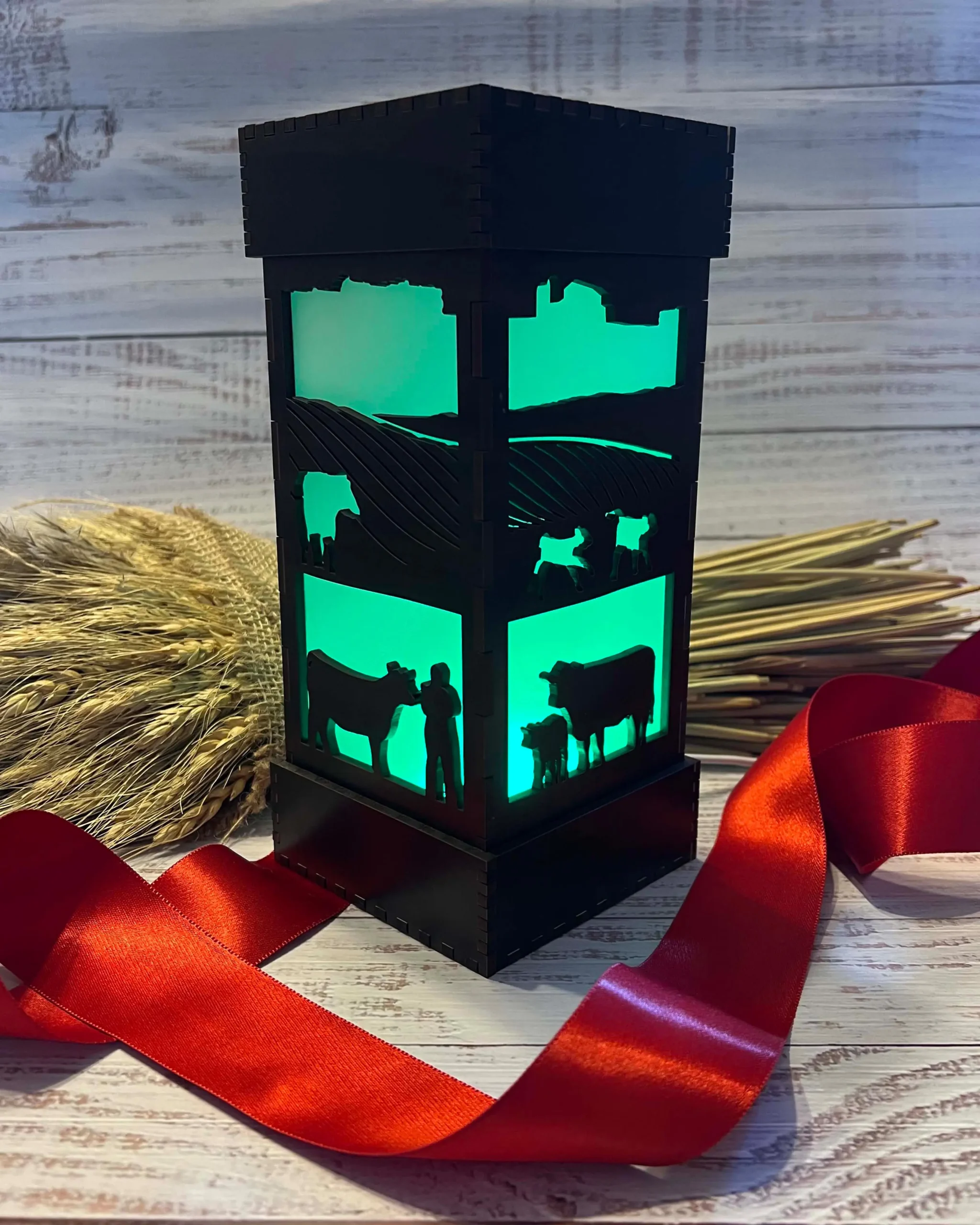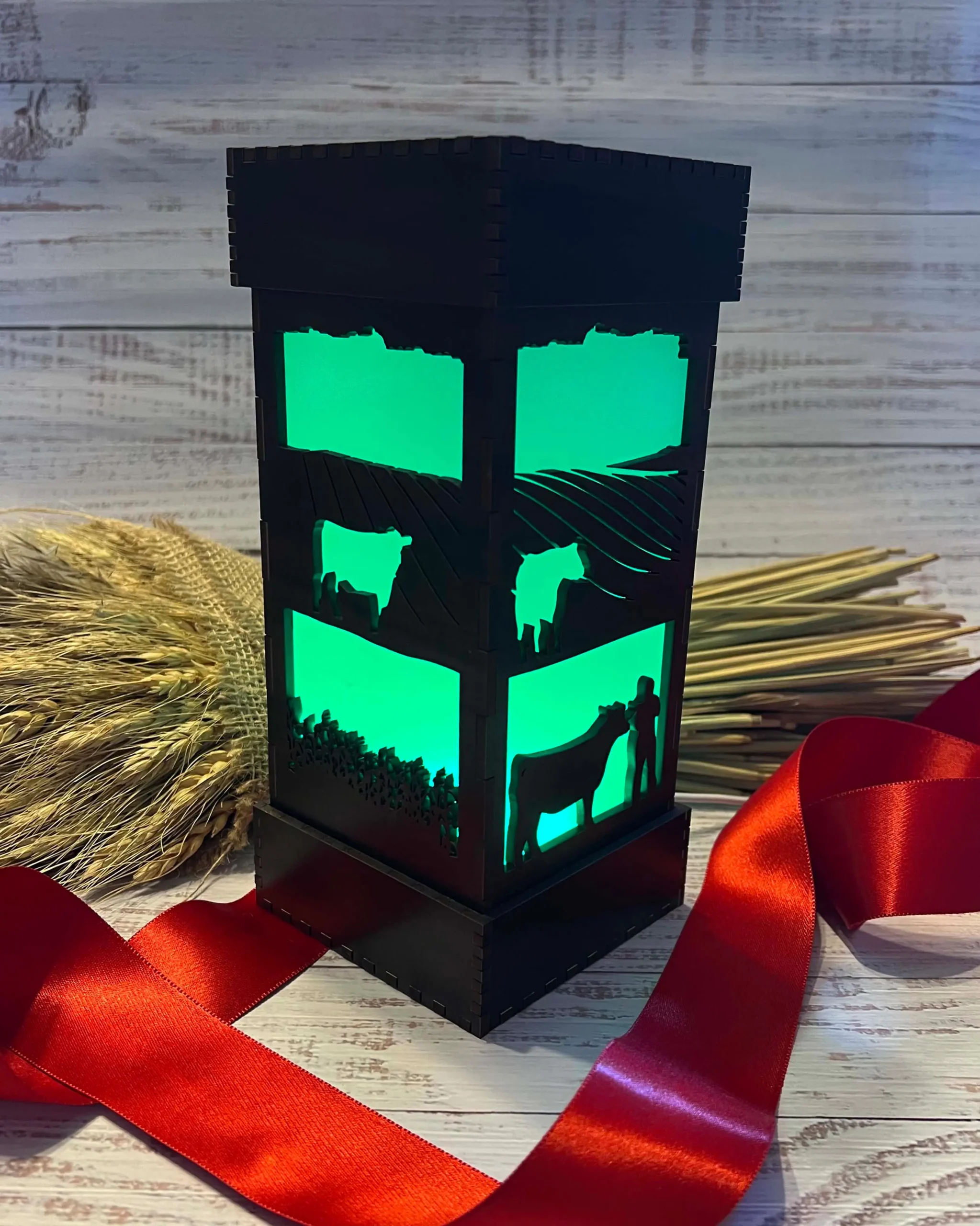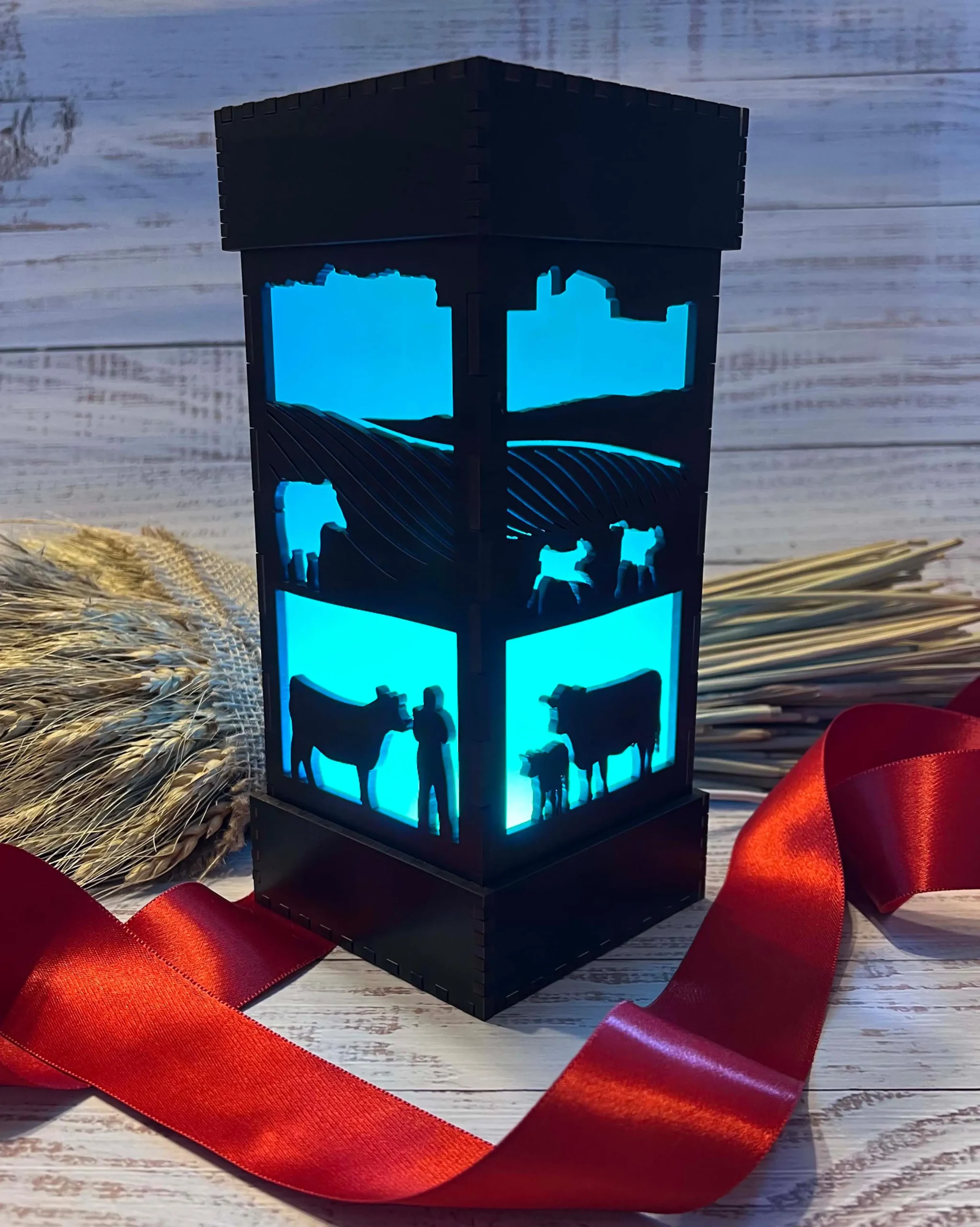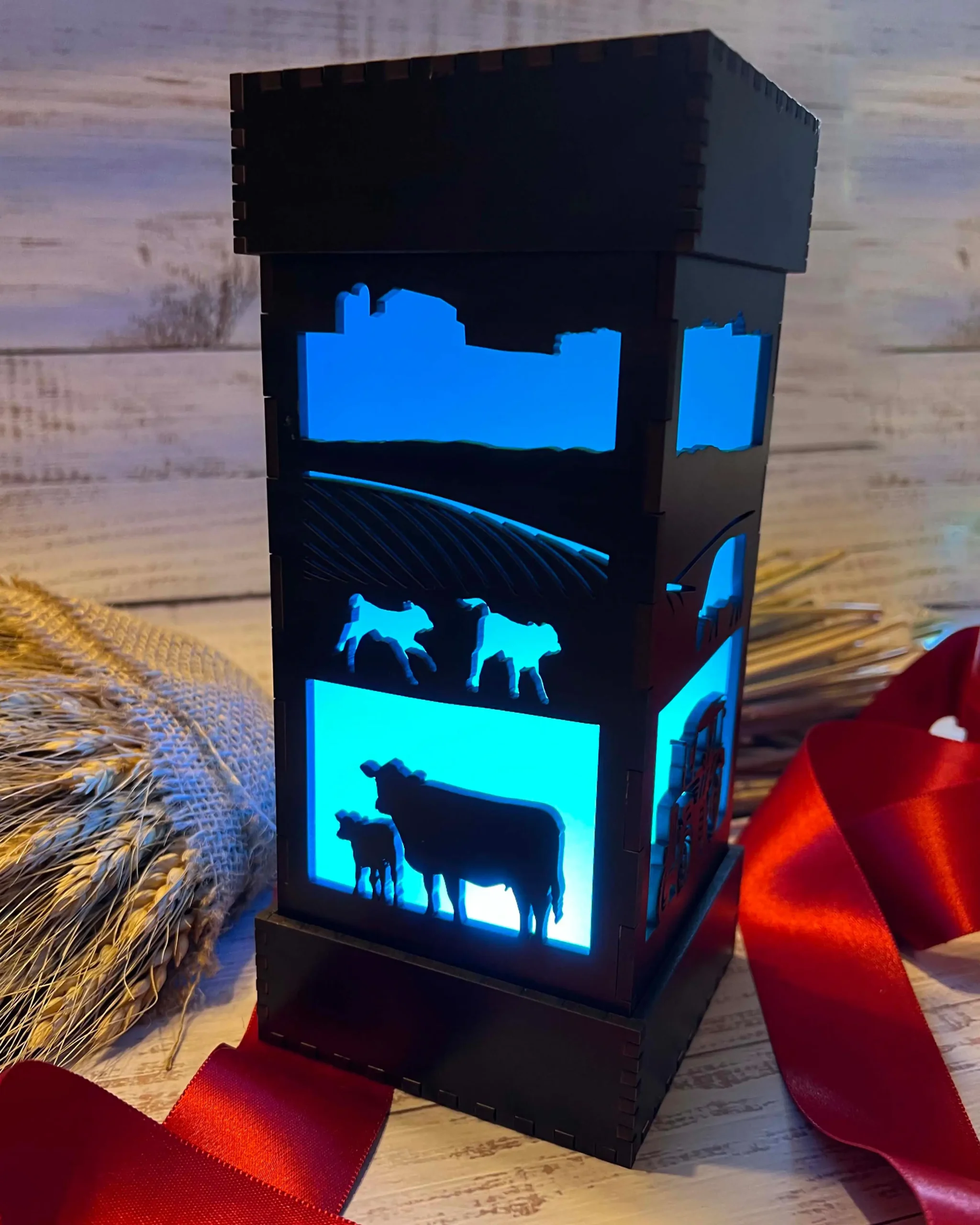 Each panel of this beautiful hand-finished LED wood-cut light features a scene from a picturesque farm, perfect to lull you to sleep or light up your desk. Cows graze in the pasture in front of rolling crop fields, with a distant tree line and barn silhouetted against the gentle glow from within. Each lamp comes with color-changing LEDs! Choose your favorite color, brighten or dim the light, or let it cycle through the full spectrum of colors (shown sped up in our gallery).