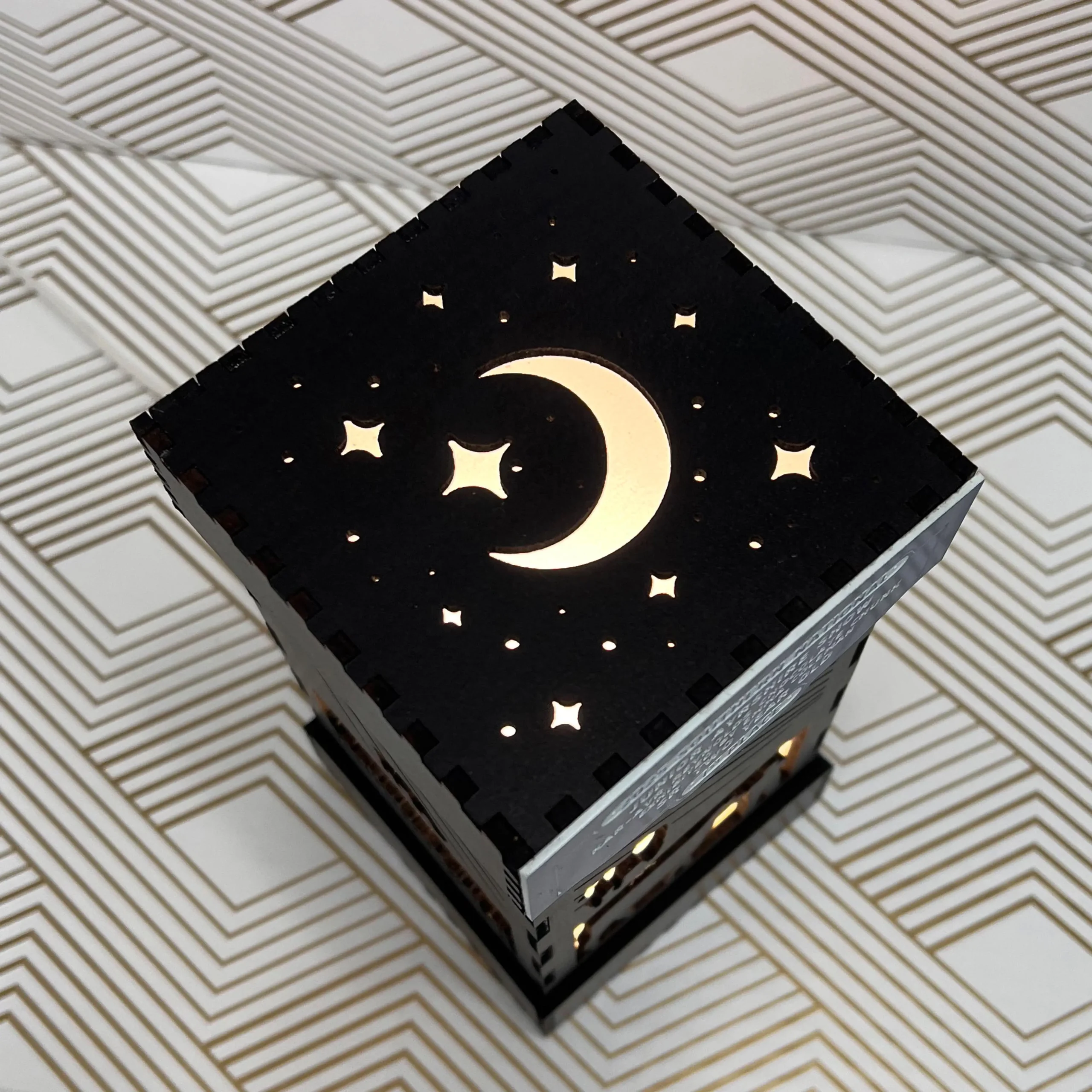 Lamp is laser-cut from ⅛” material with vellum paper to diffuse lighting. Choose from three finishes shown in our gallery – walnut, white and ebony. Walnut is real walnut ply over an MDF core, white is a painted MDF, and ebony is a dark, faux wood grain finished MDF.