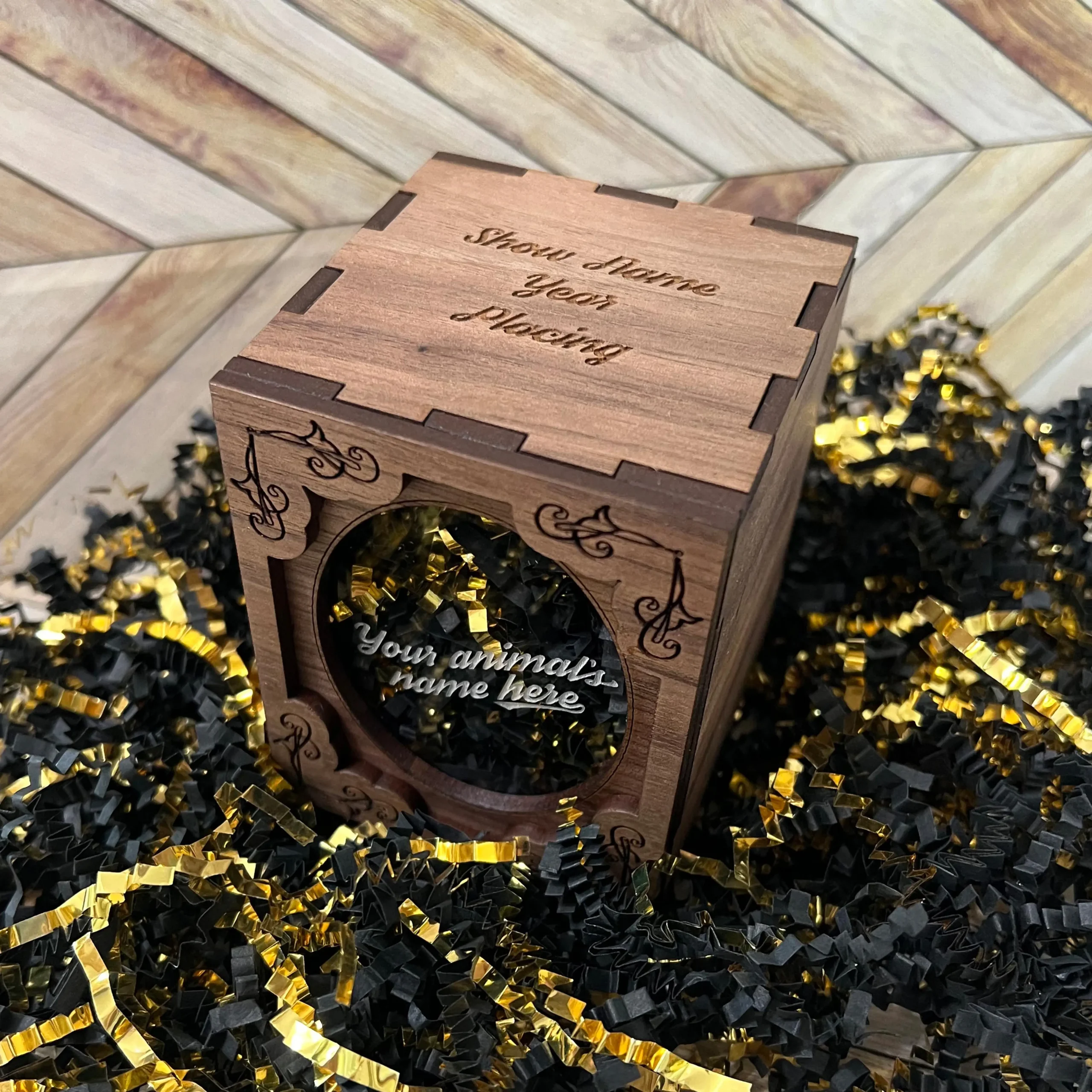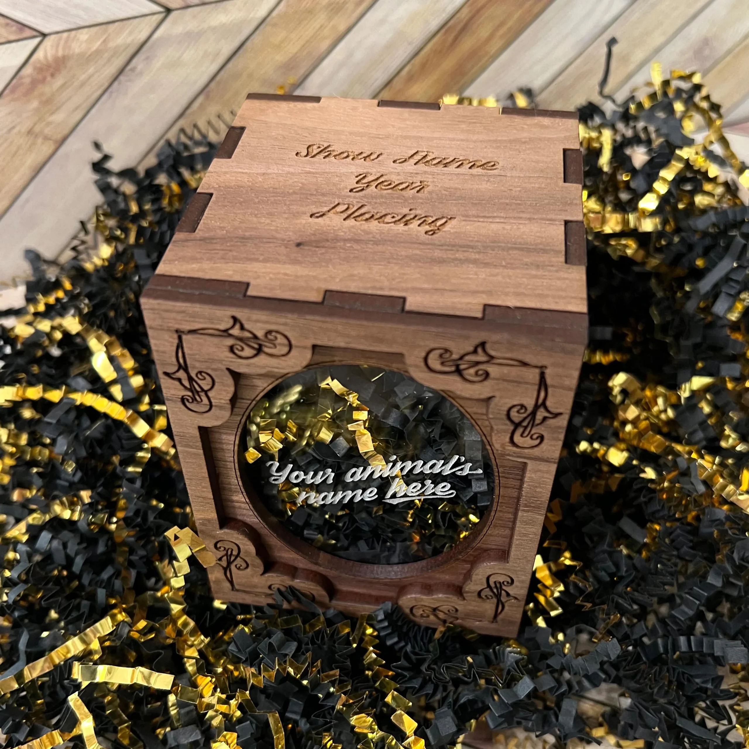 They all come customized with your choice of text on the front (which is a clear acrylic window) and the top. Include your animal’s name, show name, class or placing. If you have a show logo, we can add that too! These are perfect for any 4-Her or showman looking for a way to remember their county, state or national show! Boxes measure just shy of 3×3.5″.